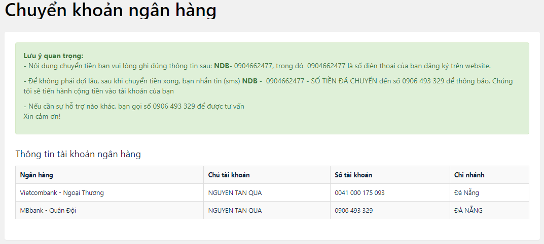 Để không phải đợi lâu, sau khi chuyển tiền xong, bạn nhắn tin (sms) [NDB-16032 - 0906493329 - SỐ TIỀN ĐÃ CHUYỂN đến số 0904 662 477 để thông báo. Chúng tôi sẽ tiến hành cộng tiền vào tài khoản của bạn