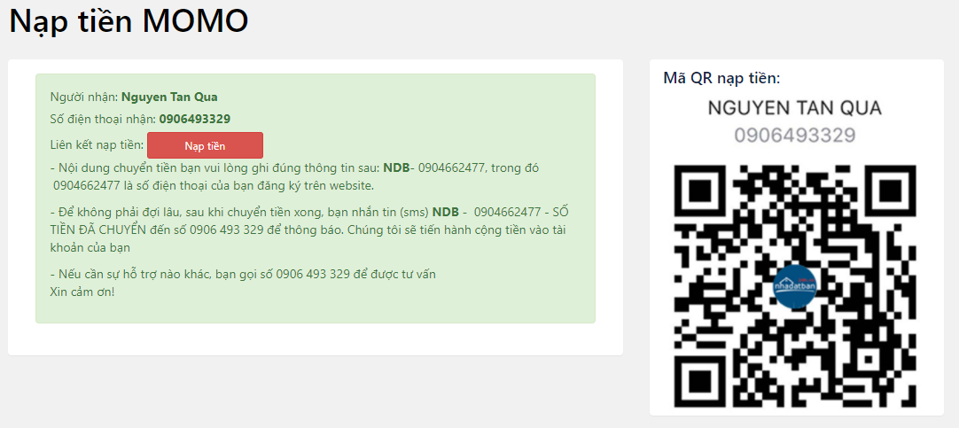 Để tiến hành mua gói đăng tin thành viên cần nạp tiền vào tài khoản thành viên trước để đảm bảo đủ số dư khi chọn gói đăng tin. Hình thức thanh toán trực tuyến đã tích hợp: tiền mặt tại công ty hoặc chuyển khoản. Thông tin chuyển khoản như sau: