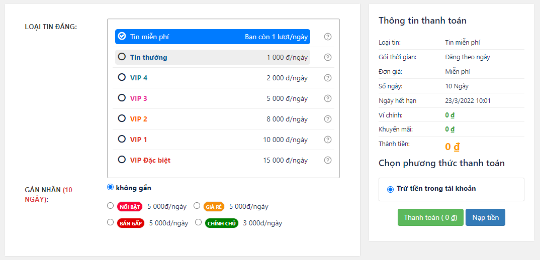 Nhadatban24h.vn cho phép thành viên đăng tin miễn phí nếu thành viên đăng tin dưới dạng “ Tin thường”. Tuy nhiên nếu thành viên muốn tin đăng của mình được hiển thị ở những vị trí ưu tiên/ nổi bật thì cần phải làm mới hoặc up tin do đó thành viên có thể nâng cấp bằng cách đăng tin VIP/ siêu VIP hoặc nâng cấp tài khoản thành viên VIP/ SIÊU VIP.